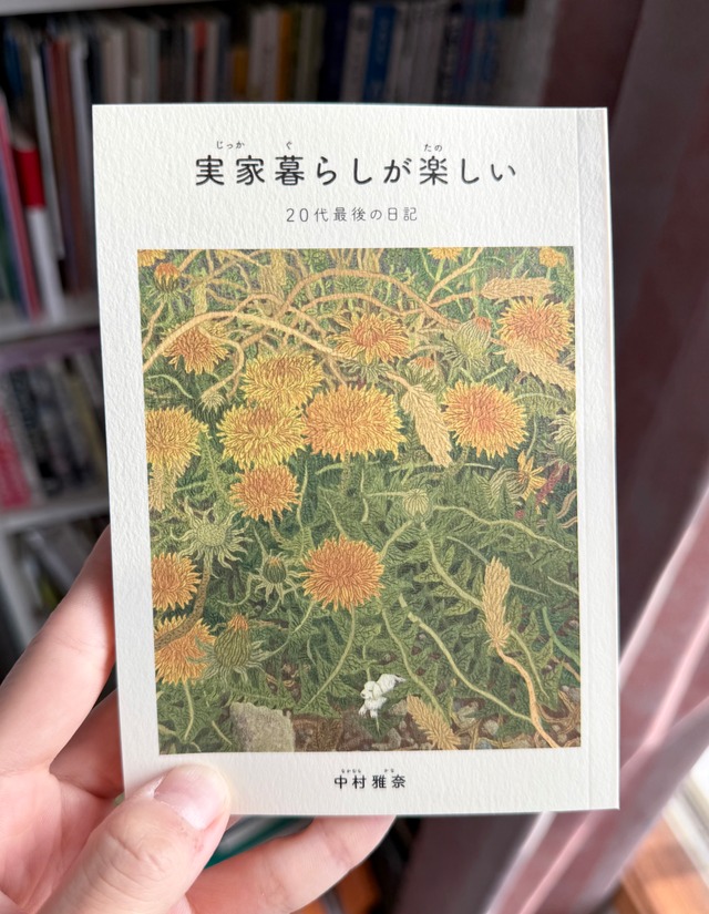 『実家暮らしが楽しい』~20代最後の日記~ 仕様:A6サイズ、本文164ページ 著者:中村雅奈 2025年12月19日発売 ※2刷 2026年1月9日発売予定 "29歳、実家暮らし。フリーランスのイラストレーター。月に1度、心療内科に通う筆者。「実家暮らしは恥だ」という呪いから解放されるヒントは、自他境界線を引くことと、自分の幸福に集中することだった…。絵を描きまくったり、アートスクールに通ったり、はじめてのタトゥーを入れてみたり、屋久島のスピリチュアル系自然合宿に参加したり、姉と韓国アイドルオーディション番組にハマったり……。20代、最後の4ヶ月間の日記。" 【本文より引用】 2025/07/08の日記 日記をつけてみることにした。 私はいま29歳で、誕生日は11月22日。137日後に30歳になる。いま美術の学校に通っているのだが、そこの飲み会で今後の制作について悩みを話した。すると校長が「そりゃもう、お前がなにしたいかだよ」と、ごもっともすぎるアドバイスをもらった。 自分は今後、どのように生活していきたいんだろうか? まず、憧れている作家さんをあげてみる。ミロコマチコさん、阿部海太さん、はしもとみおさん……。 地方の街で戸建てに住み、自然に囲まれて動物と暮らし、自分の信仰する絵を描いていたい、ということだろうか?ずっと東京から出たことがないから、いきなり車が必須な場所への移住は難しいかもしれない。犬と暮らしたいとは思う。 自分が1番に望む事は、1人暮らしにもどること。ずっと実家暮らしでズルズル40代50代になるのがおそろしい。この暮らしに至った経緯は書かないし、恥だとも思わないけど、自分を好きになるためにまずは自立がしたい。 しいねはるかさんの「未知を放つ』を読む。しいねさんの苦労と比べたら、私はなんて、こどものまま20代を過ごしてしまったんだろう。と自己嫌悪に陥る。 本当に、人と関わらなさすぎのまま、生きてきてしまった。 絵の仕事をしてるから同僚がいない。ちょっとでも脳が暇になると、この人生は正しいのだろうか?と、真っ暗でだれもいない廃墟に立っているような、ぐらっとした気持ちになる。だから、びっちりと仕事を埋め込んでしまう。そうしていたら、母と姉以外、ほぼ交流のない人生になってしまった。 フリーランスゆえの収入不安定さも関係している。貯金額とメンタルの余裕は比例する! 2番目に望むことは、他人とちょっとでも関わって生きていくことだ。 「本来の存在の確認は交わりにおいて存在するのであります」 (ヤスパース「哲学入門』(草薙正夫訳、新潮文庫刊、1954年) このとおりなら、私はまだ世の中にいないということになる。 いろいろ書きすぎたのでここまで。今日は、日本橋高島屋のイベントで販売する、新しいポストカードセットを作った。A5サイズで大きくてかわいい。アニメ「PSYCHO-PASS」を流しながら、BREWBOOKSの尾崎さんに依頼された、親知らずの外科手術レポマンガをかく。夕飯はカレーを作った。夜中に姉が夜食で2度目のカレーを食べていた。うれしい。 【引用終わり】 【お取り扱い店舗さま】2026.1.10更新 ※在庫切れの可能性がございますので、ご確認いただくことをお薦めいたします。 ⚫︎東京都 ・twililight(三軒茶屋) ・BREWBOOKS(西荻窪) ・ポポタム(南阿佐ヶ谷) ・青山ブックセンター本店(表参道) ・三省堂書店 神保町本店 ・本屋B&B(下北沢) ・日記屋月日(下北沢) ・タコシェ(中野) ・蟹ブックス(高円寺) ・BOOKSHOP TRAVELLER(祖師ヶ谷大蔵) ⚫︎千葉県 ・本屋lighthouse ⚫︎宮城県 ・button ⚫︎長野県 ・本・中川 ⚫︎三重県 ・図書室ふたつの月 ●北海道 ・NOMAD BOOKS ●兵庫県 ・古本と新刊 納屋文庫 ⚫︎秋田県 ・BAILEY BOOKS お取り扱いご希望のお店の方がいらっしゃいましたら、希望冊数、委託or買切か、お振込予定日をメールでご連絡くださいませ。(委託7掛、買切6掛、送料は中村負担) メール [email protected]